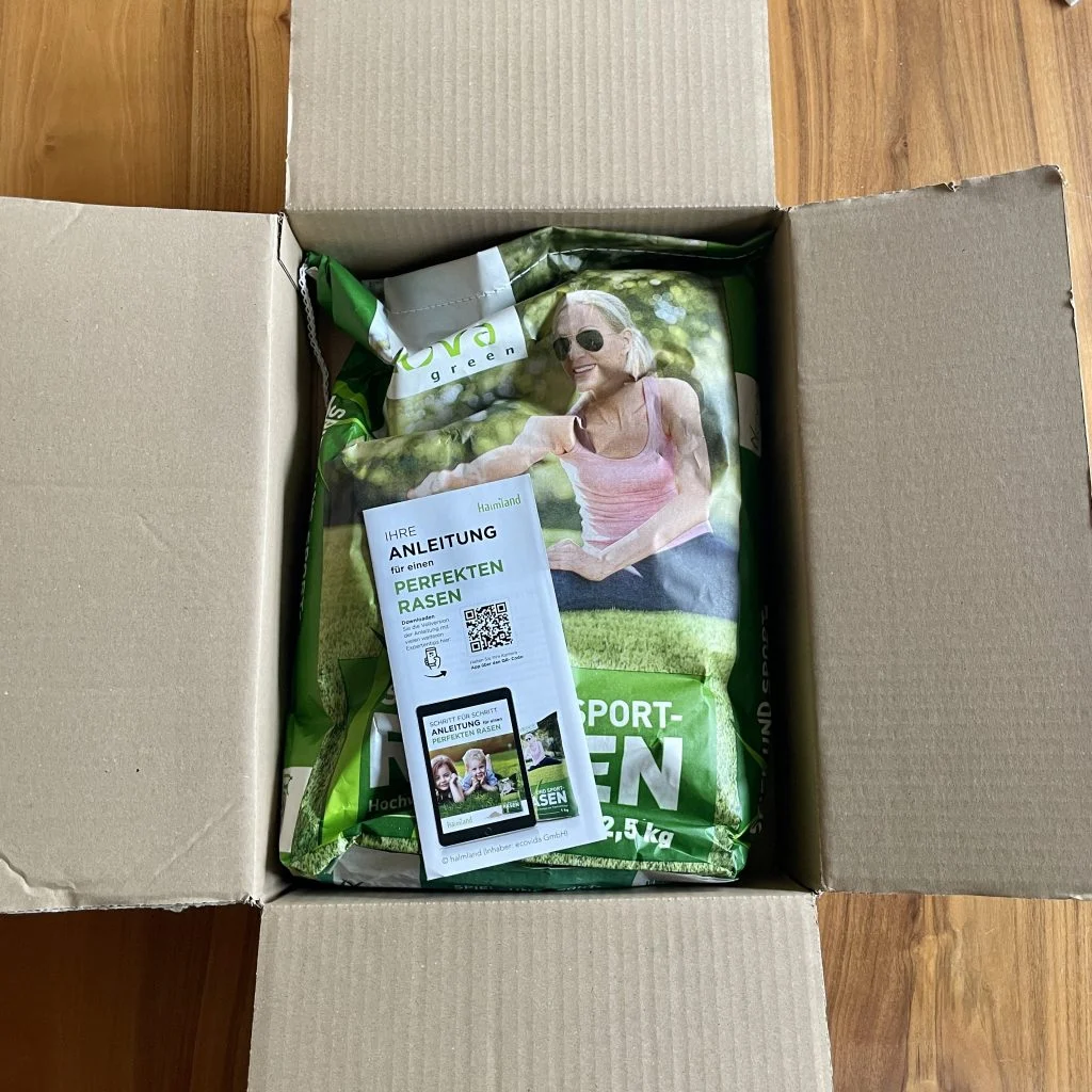 The lawn seeds are in paper packaging and were delivered in an undamaged box. This box is thick, extremely stable and was on the exact Adjusted the dimensions of the product packaging. This has the advantage that the product does not wobble around within the pack and ideal is protected from external influences.